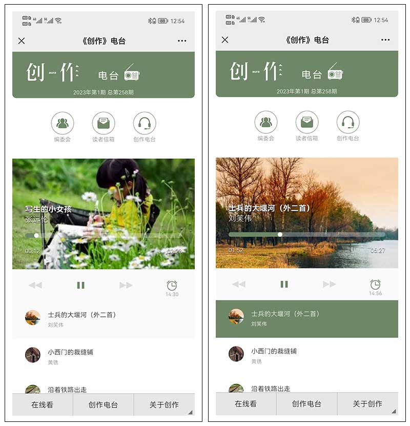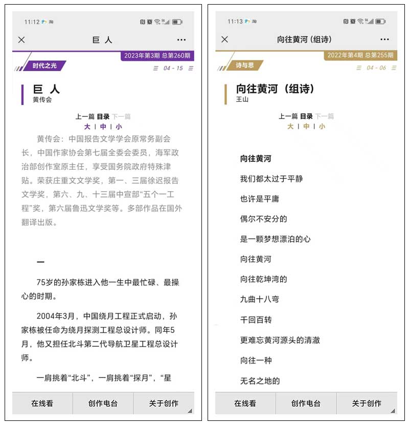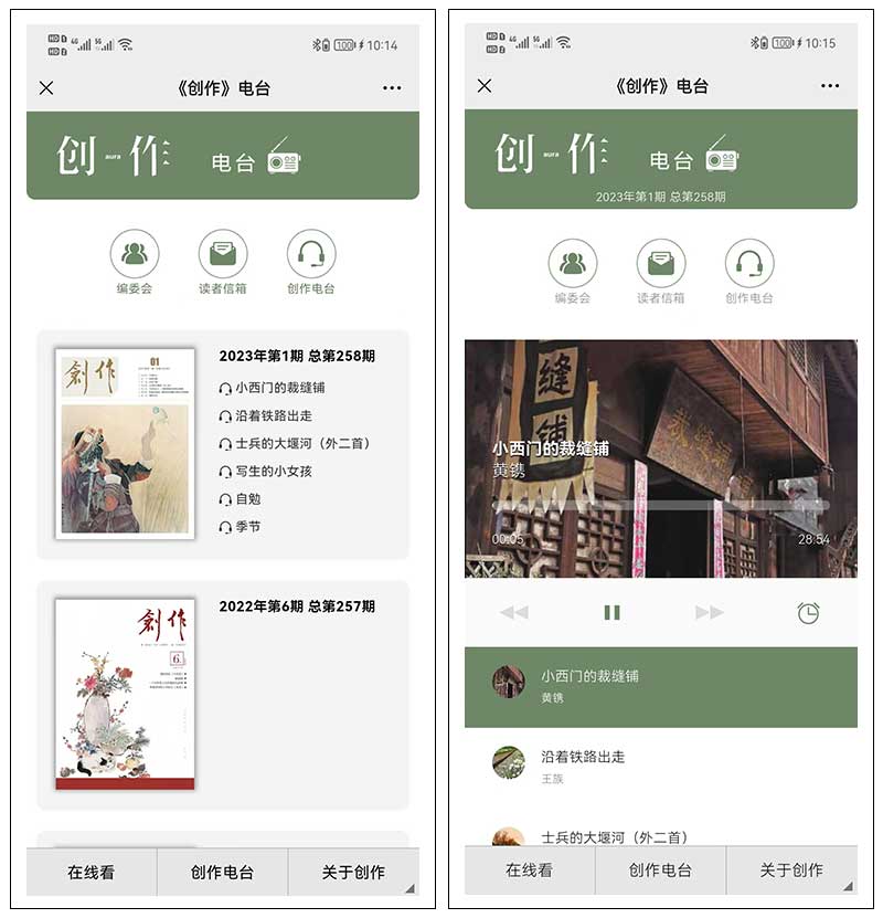 關(guān)于切換,頻道切換可通過公眾號的大菜單(在線看/創(chuàng)作電臺/關(guān)于創(chuàng)作)切換;該期雜志內(nèi)的逐篇閱覽或文章切換,可通過“上一篇”、“下一篇”、“目錄”切換;